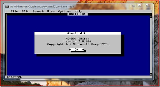 Don't ask why I was trying this, but I found it slightly odd that Microsoft was still shipping edit from the MS-DOS days - in fact, as you can see, the copyright is for 1995. And yes, it is a 16-bit app being hosted by ntvdm.exe (Windows 16-bit virtual machine). Weird!
